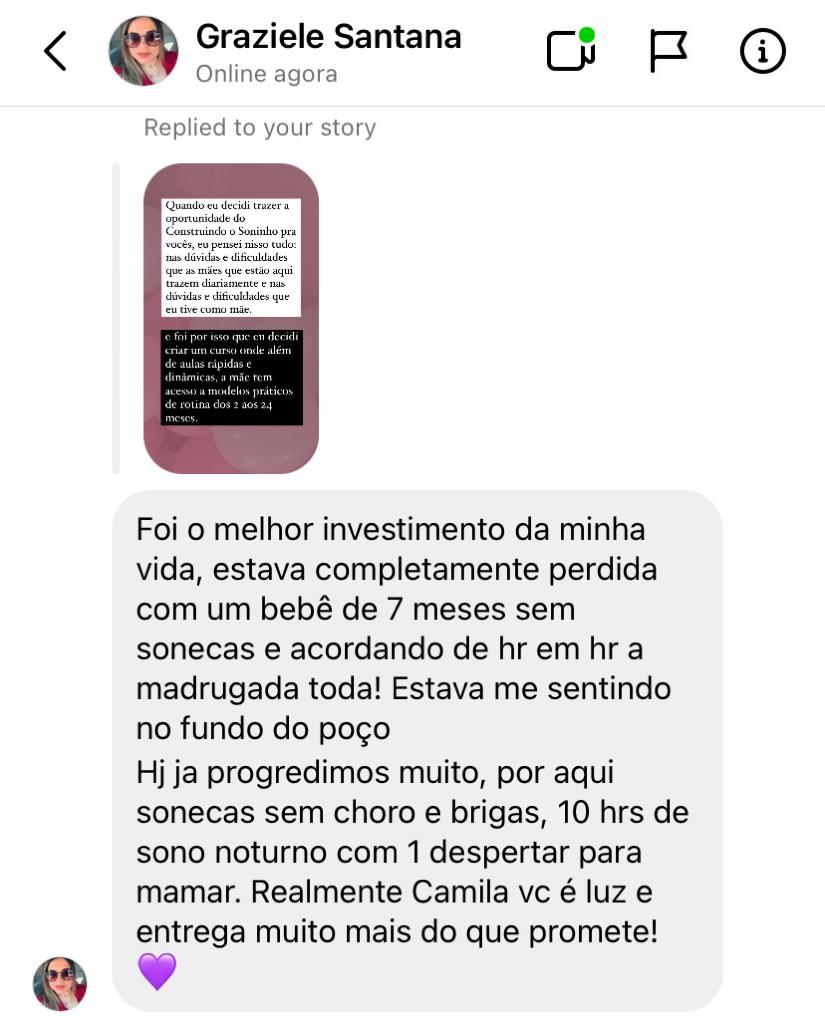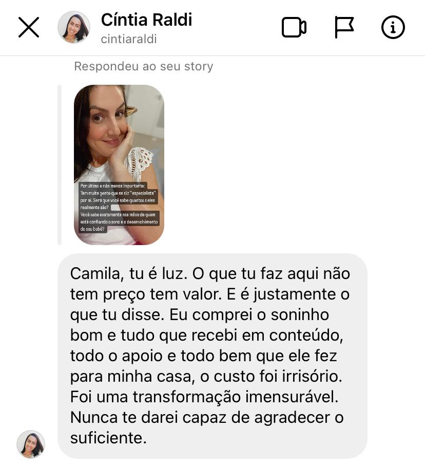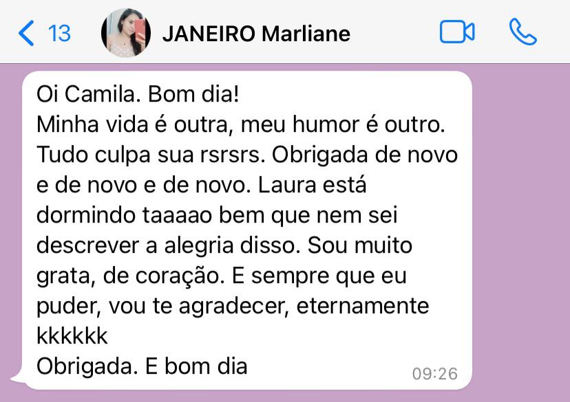 Após vencer as noites em claro com a própria filha que chegava a acordar 18 vezes por noite, Camila se especializou em sono do bebê e já orientou mais de 3.000 famílias ao redor do mundo que hoje dormem bem e tem a paz de volta a seus lares